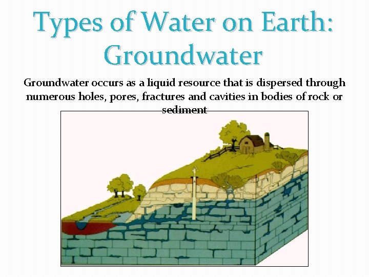Type of FreshwaterGroundwater Groundwater occurs as a liquid resource that is dispersed through numerous holes pores fractures and cavities in bodies of rock or sediment 8. Water is distinguished on the basis of its origin consistency composition and treatment 1. The vast majority of water on the Earths surface over 96 percent is saline water in the oceans.