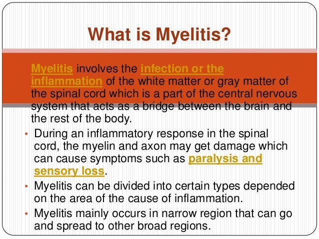 It is not a disease in itself but a symptom of a range of conditions so diagnosis can be a complex process. Symptoms may develop suddenly over a. Myelitis is often referred to as transverse myelitis but this refers to inflammation across the left and right side of the spinal cord.