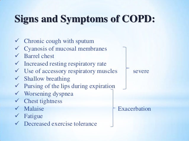 More severe COPD signs and symptoms include feeling more fatigued and short of breath and you may suffer frequent exacerbations. Many people with COPD develop most if not all of these signs and symptoms. Chronic obstructive pulmonary disease better known as COPD is a condition in which breathing becomes more and more labored over time.