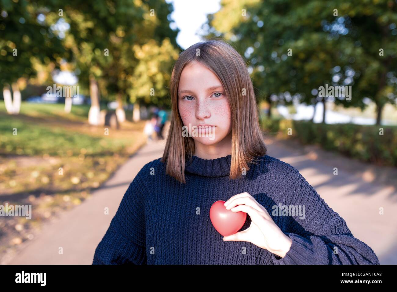Teenager Girl Of 12 15 Years Old In The Summer In The City Holds A Toy Heart In Her Hand Concept Gift Love Parenting Help And Support Knitted Stock Photo Alamy