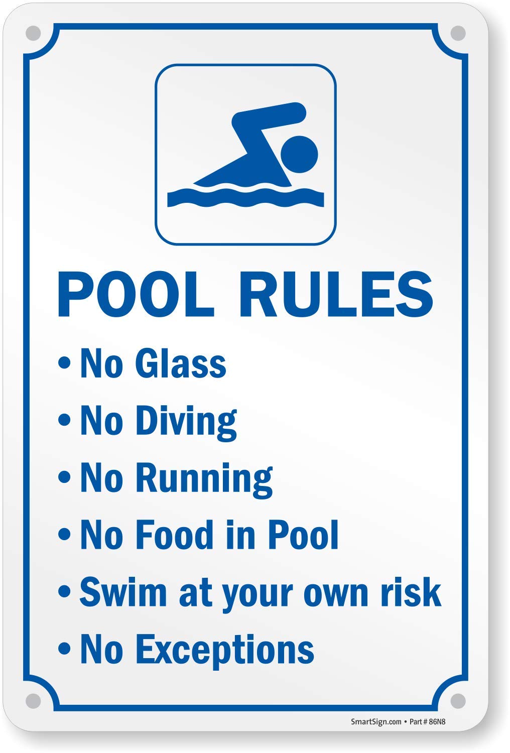 Amazon Com Smartsign 18 X 12 Inch Pool Rules No Glass No Diving No Running Swim At Your Own Risk Metal Sign 63 Mil Laminated Rustproof Aluminum Blue And White Garden Outdoor