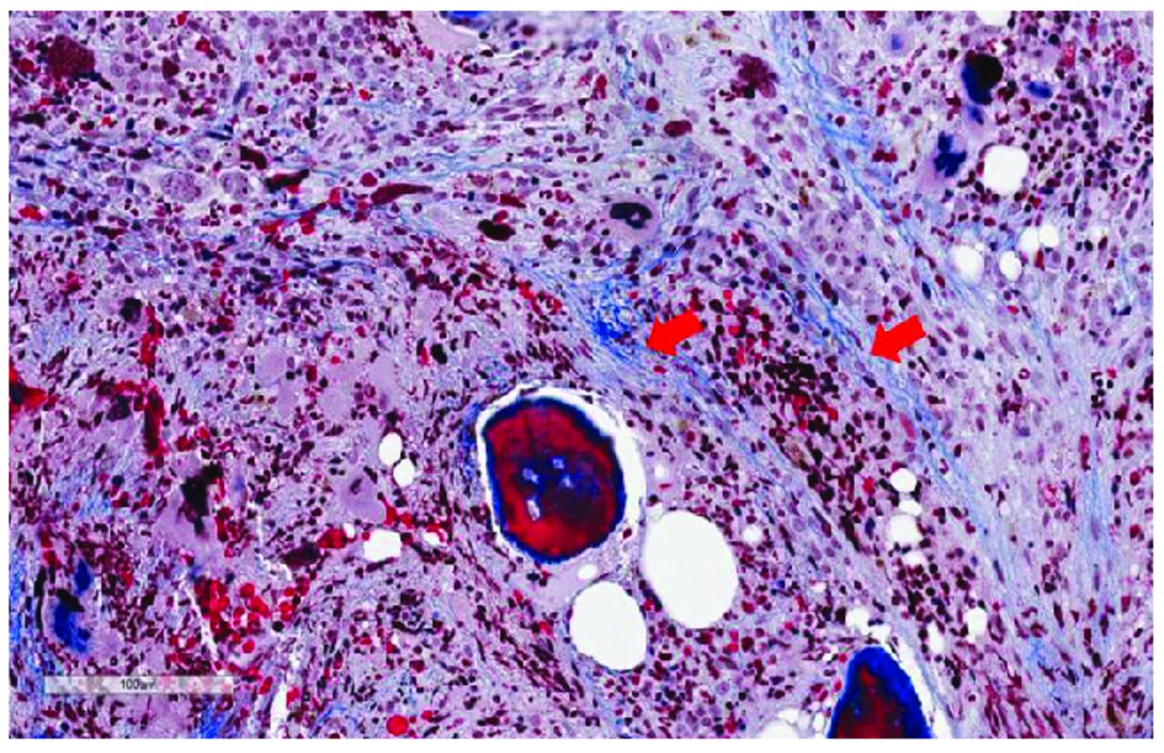 Bone marrow fibrosis is a central pathological feature and World Health Organization major diagnostic criterion of myelofibrosis.