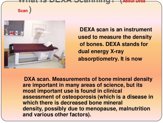 A dexa scan assesses bone density. This technique was introduced for commercial use in 1987. No special preparations are needed.