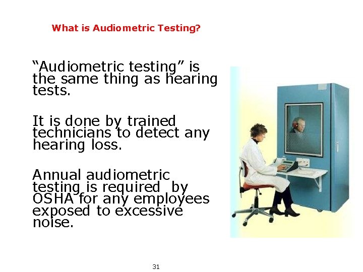 OSHAs Noise standard requires only that audiometric testing be made available to all employees whose exposures equal or exceed an 8-hour time-weighted average of 85 dBA. Our audiometric testing is conducted onsite at your workplace and offers a convenient and cost-effective way to monitor your employees hearing over time. Audiometric testing monitors an employees hearing over time.